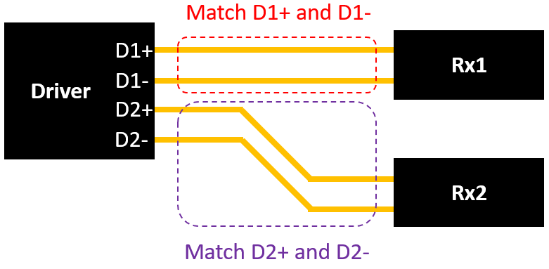 上面顯示的差分對在單個驅動器(例如,FPGA)和兩個不同的接收器之間路由。每個接收器分別讀取D1和D2上的差分信號。在此,差分對D1的每一端都需要進行長度匹配。類似地,差分對D2的每一端都需要長度匹配。但是, D1和D2不需要彼此匹配,因為它們沒有并行傳輸數(shù)據(jù)。這些差分對中的每對一次只傳送一個比特,我們只需要進行長度匹配以確保在每對中消除共模噪聲。