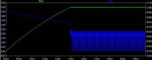 瞬態(tài)分析使您可以看到輸出紋波,穩(wěn)定的電壓電平以及電壓紋波與其他組件中的電壓/電流的比較。下面顯示了在上述調(diào)節(jié)器級中將輸出電壓與電感器電流進(jìn)行比較的示例。下圖還顯示了低輸入電壓的結(jié)果。掃描輸入電壓時,您可以生成多個圖形并確定電壓電平何時停止增加(即,穩(wěn)壓器中的MOSFET何時飽和)。