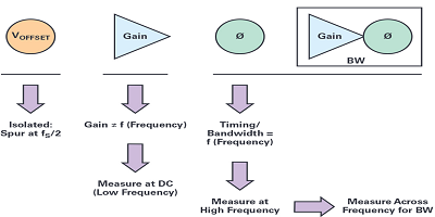 如果僅看增益不匹配,則是低頻或直流不匹配類型。通過在接近dc的低頻下執(zhí)行增益測量,然后在更高的頻率下執(zhí)行增益測量,可以將帶寬不匹配的增益分量與增益不匹配分開。增益不匹配不像帶寬不匹配的增益分量那樣是頻率的函數(shù)。類似的方法用于時(shí)序失配。在接近dc的低頻下執(zhí)行測量,然后在更高的頻率下執(zhí)行后續(xù)測量,以將帶寬不匹配的時(shí)序分量與時(shí)序不匹配分開。