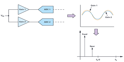 交錯(cuò)ADC時(shí)要注意的一件事是,在輸出頻譜中出現(xiàn)的雜散是由與交錯(cuò)ADC相關(guān)的缺陷引起的。這些缺陷基本上是兩個(gè)交錯(cuò)的ADC之間的不匹配。四個(gè)基本不匹配導(dǎo)致輸出頻譜中的雜散:偏移不匹配,增益不匹配,時(shí)序不匹配和帶寬不匹配。