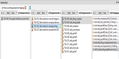 在圖6中,選擇了一個(gè)高級(jí)需求,并且高亮顯示了對(duì)系統(tǒng)級(jí)別需求的上游可追溯性和對(duì)低級(jí)別需求以及源代碼功能的下游可追溯性。