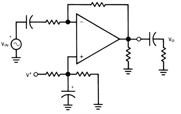 這是使用運算放大器,電阻器和電容器實現(xiàn)的簡單放大器電路。通過為電阻器和電容器選擇合適的值,可以在輸出端獲得顯著的增益。